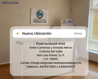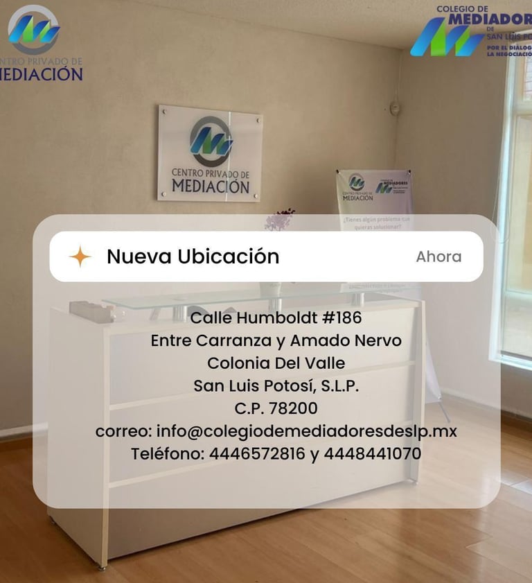 El Colegio de Mediadores de San Luis Potosí, se complace en invitarte a formar parte de nuestra Asociación, en donde además de los cursos y capacitaciones que tendremos, te podremos auxiliar para lograr tu certificación y autorización como Facilitador Público o Privado, además de que podemos asesorarte para que puedas abrir tu propio Centro Privado de Mediación.